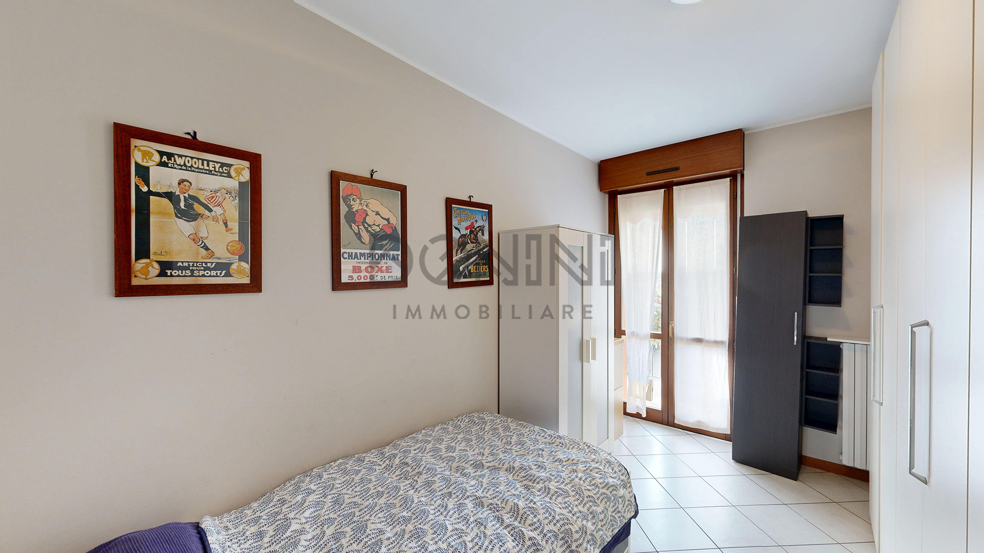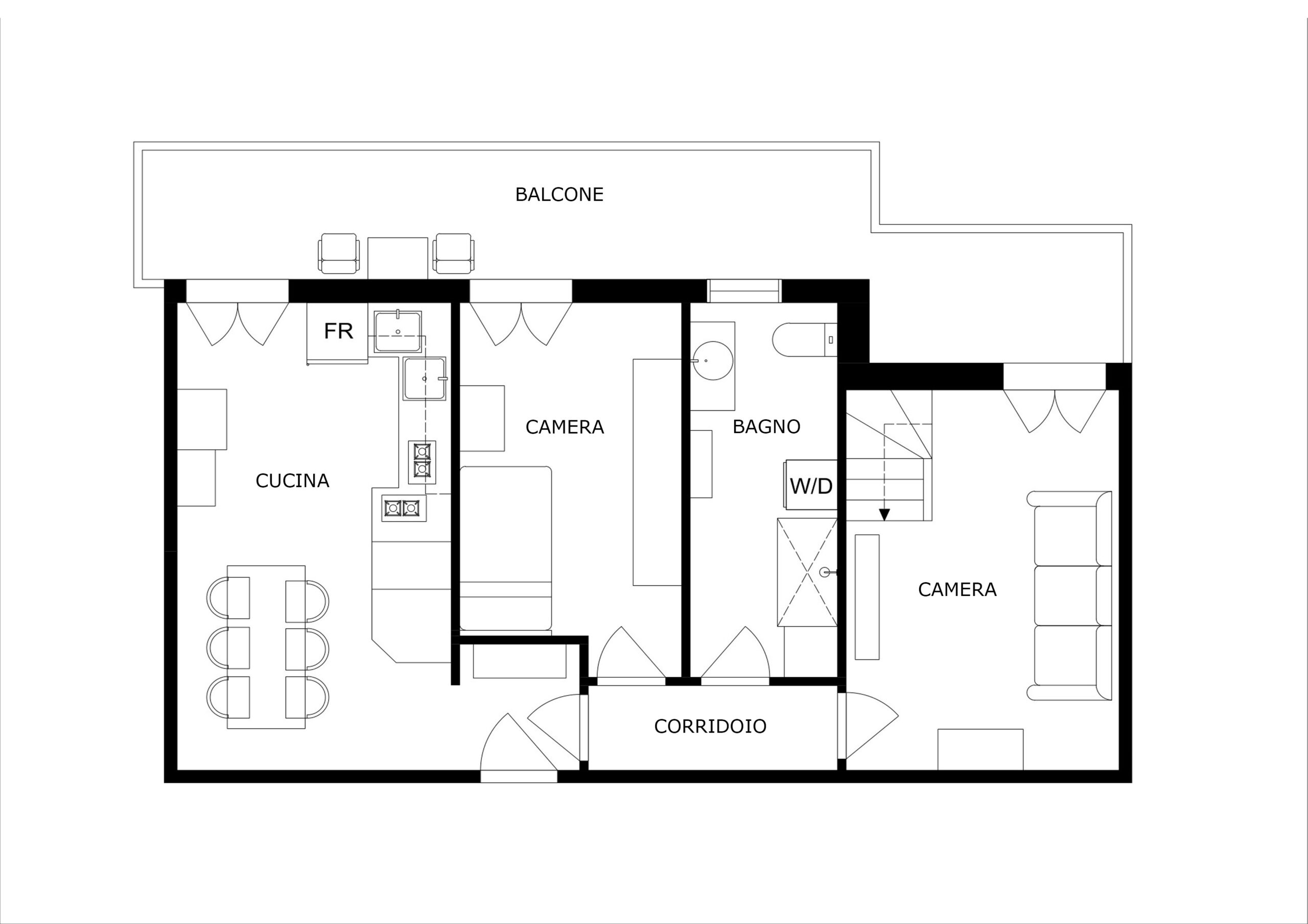 La zona notte comprende due camere da letto, un bagno finestrato e un ampio balcone sul quale affacciano tutti gli ambienti, garantendo luce naturale e continuità tra interno ed esterno.